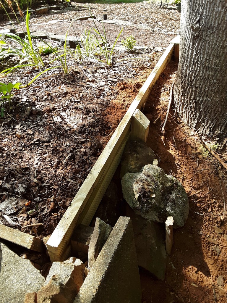 Off to one side of the smaller deck was an eroding flower garden. I installed a little barrier and back filled it to preserve the level space.
